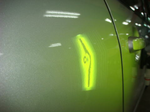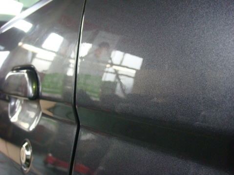 リヤドア中央に出来てしまった7cmのデント。さほど深くはないものの黒いボディーに存