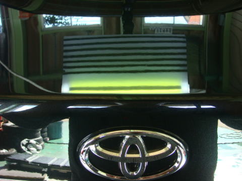 テールランプの上、プレスラインを挟んで8cmのデントです。右の黒い縦のラインと比べ