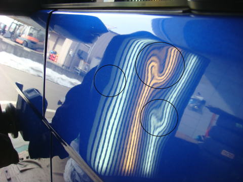 ドアミラー下に衝撃点が2ヶ所とその5cmほど左側に出っ張りがあり、同時に出来たもの