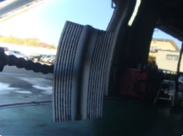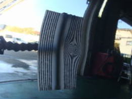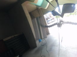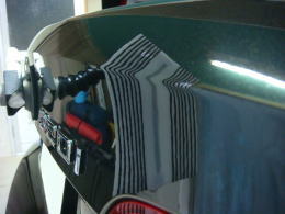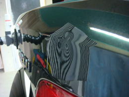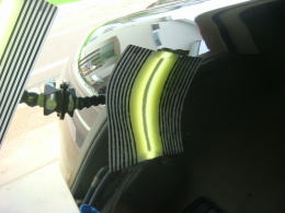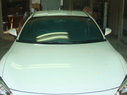 8月22日に降った雹による被害車両です。この町に生まれ初めて雹を体験しました。降った雹の大きさは数mmから4cmとの事で、地域もまばらで大きさもまちまちの様です。当ショップの辺りでは数mmから2cm弱で数分間降りました。この車両の被害はボンネット・ルーフ・トランク・フロントフェンダーで計30個。よ〜く見ないと判らない位の軽度の被害でした。黄色いテープが貼ってある所がへこみです。