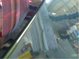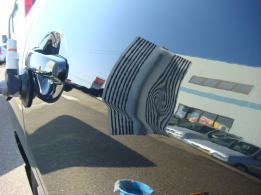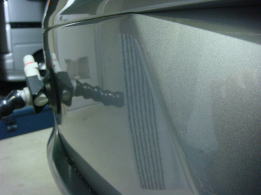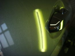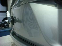 20cm強で浅めのデントです。分かりづらいかも知れませんが、映り込んだ黒のラインが乱れているのがへこんでいる場所です。