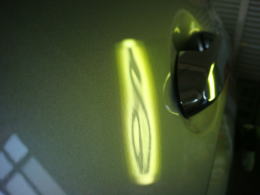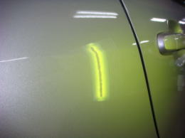 リヤドア中央に出来てしまったデント。さほど深くはないものの黒いボディーに存在感ありでした。