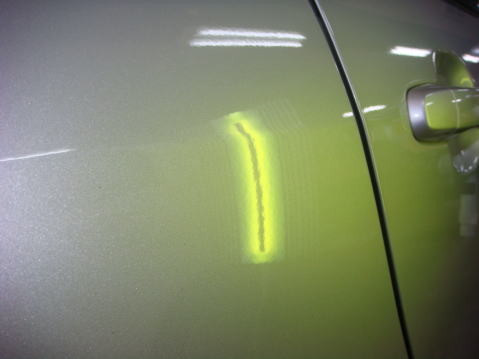 リヤドア中央に出来てしまった7cmのデント。さほど深くはないものの黒いボディーに存