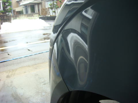 て雪の壁に接触してしまったのでしょう。フロントフェンダーは意外とペッコリへこみや