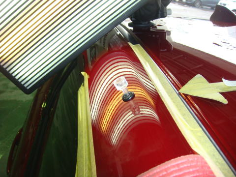 こちらのデントはプーリングでリペア出来る範囲のデントと判断。ルーフトリムの脱着を