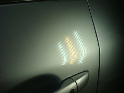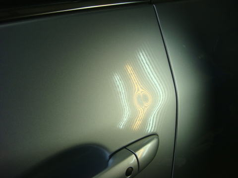 ドア中央よりやや下のプレスラインをまたいで10cmのデントです。