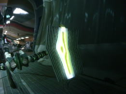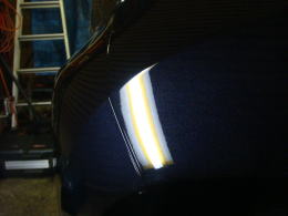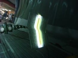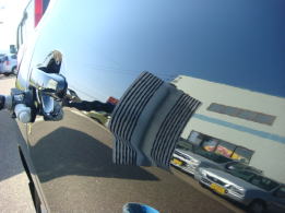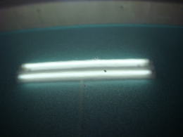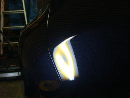 20cm強で浅めのデントです。分かりづらいかも知れませんが、映り込んだ黒のラインが乱れているのがへこんでいる場所です。