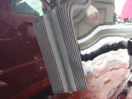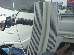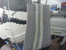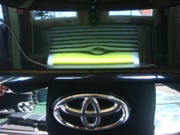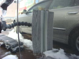 8月22日に降った雹による被害車両です。この町に生まれ初めて雹を体験しました。降った雹の大きさは数mmから4cmとの事で、地域もまばらで大きさもまちまちの様です。当ショップの辺りでは数mmから2cm弱で数分間降りました。この車両の被害はボンネット・ルーフ・トランク・フロントフェンダーで計30個。よ〜く見ないと判らない位の軽度の被害でした。黄色いテープが貼ってある所がへこみです。