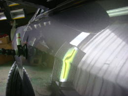 と言う事は「直しやすいでは」と思われるかと思いますが、大きければそのひずみもまた広範囲です。それでもフロントフェンダーは作業性が良く、こんな感じに修復出来てしまうんですね。