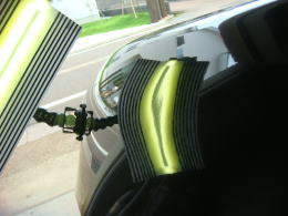 へこみはパネルの裏の補強のフチにあった為ルーフライニングに一部隙間を作り、そこから薄いツイストツールをすべり込ませ補強をテコにアクセス へこみは綺麗になくなりました。