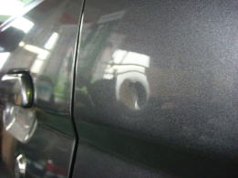 リヤドア中央に出来てしまったデント。さほど深くはないものの黒いボディーに存在感ありでした。